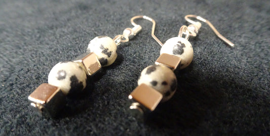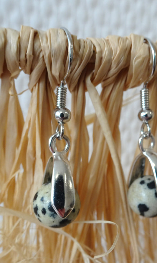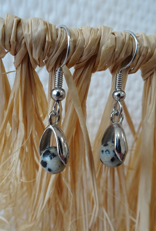 Boucles d'oreilles perles naturelles beige mouchetées de noire 6mm posée sur étrier argenté - BO003/E6