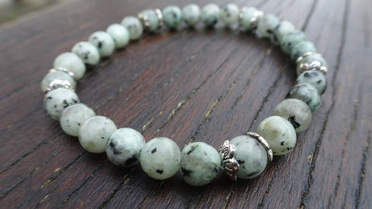 Bracelet perles naturelles 6 mm vert sauge mouchetées de noir - BR152